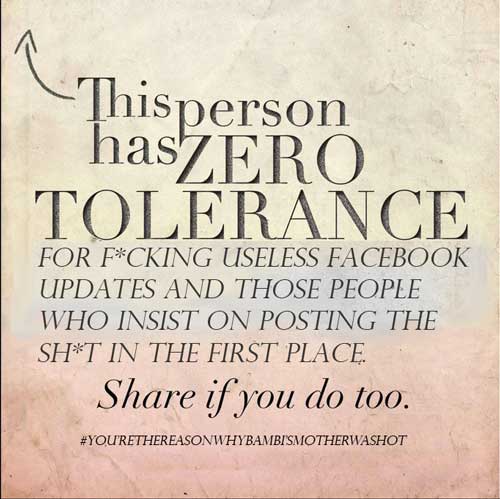 There are also images posted for a cause, which happily will draw an arrow to the person’s profile image in a vain attempt to ensure that the person sharing the gumph really does care about what they say. Normally it’s associated with the type of thing that has a good cause like “Stop Children from playing with barbed wire” or “Violence against old people: let’s actually start doing it properly.”